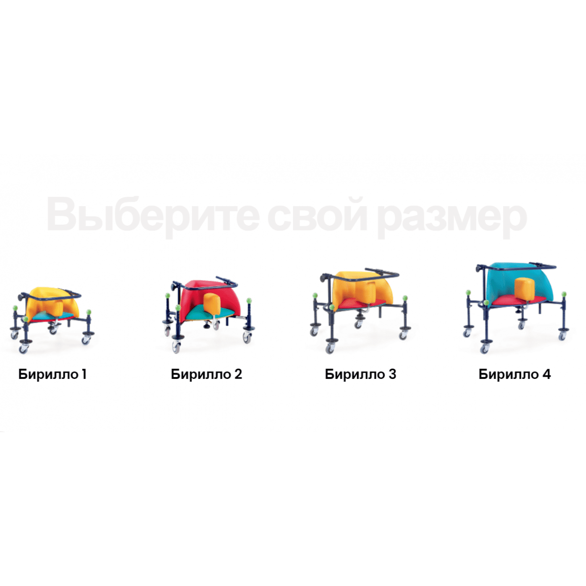 Сиденье для детей с ДЦП Birillo поставляется в 4х размерах и имеет ряд дополнительных аксессуаров, расширяющий возможности использования. Рама регулируется по высоте и сделана из стали с эпоксидным покрытием. Колёсики имеют свои «бамперы» для дополнительной защиты. Поручень регулируется по высоте и глубине. Сиденье и спинка имеют противопожарное покрытие из износоустойчивого материала для длительной эксплуатации, который легко подвергается гигиенической обработке.