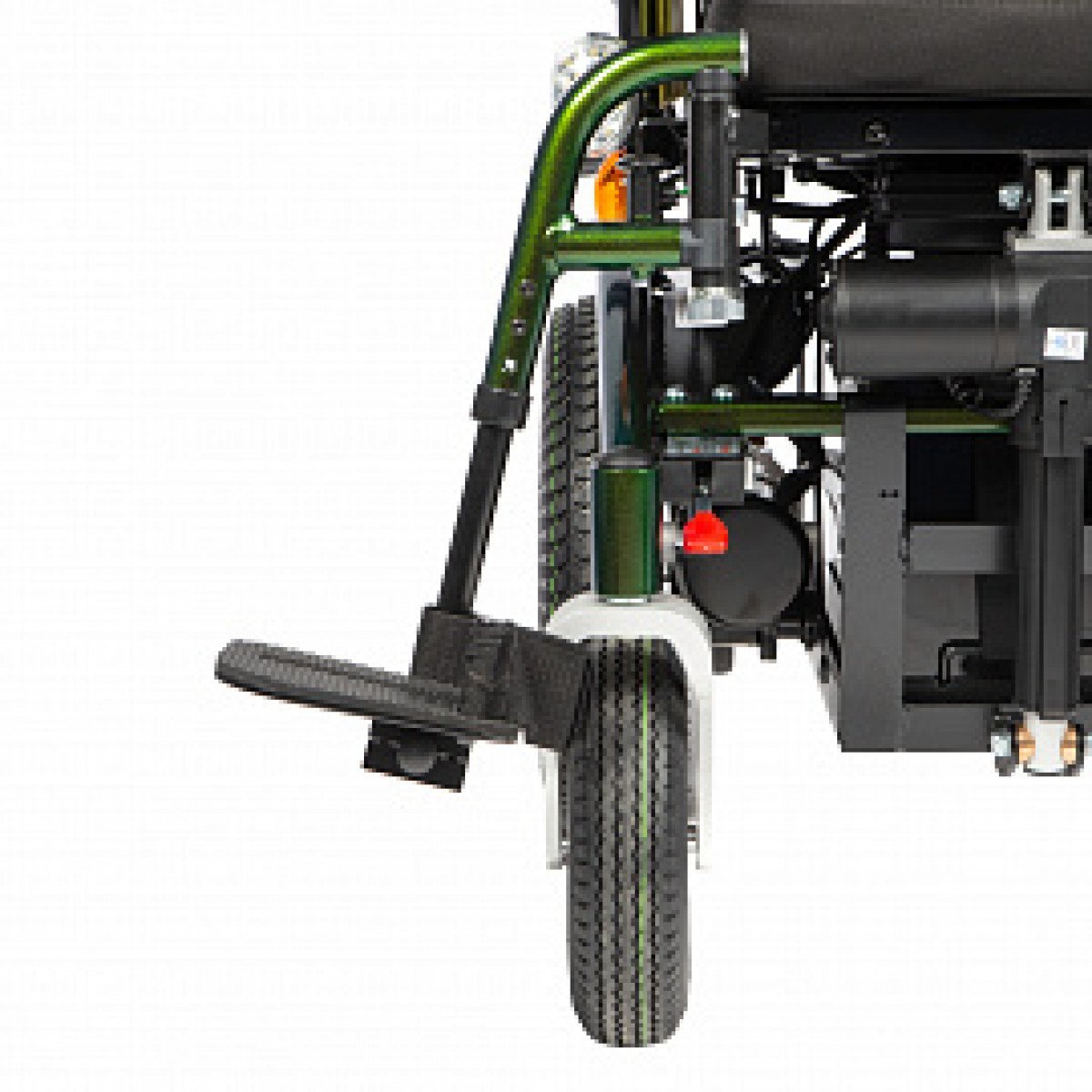 Коляска имеет два привода мощностью 450 Вт с редукторами и электромагнитным тормозом. Электромагнитный тормоз предотвращает откат коляски с наклонных поверхностей. Одного заряда аккумуляторов хватит на 30 км движения без подзарядки со скоростью до 7 км/ч.