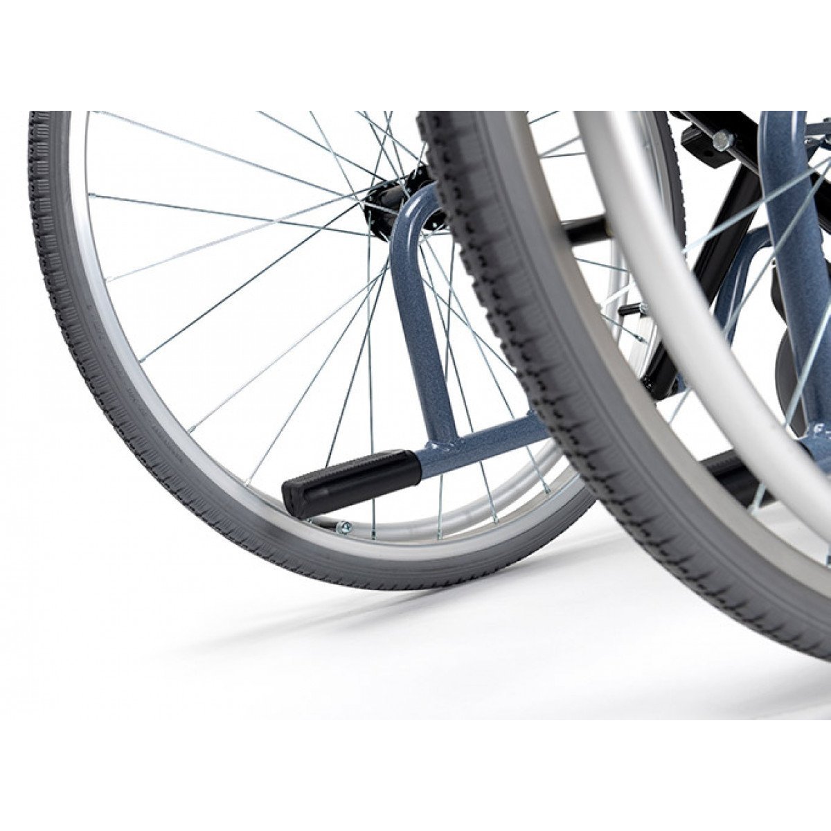 Одной из ключевых особенностей данной модели является смещение задних колёс в сторону, что значительно улучшает стабильность и управляемость коляски. Это решение позволяет обеспечить более надёжное передвижение по различным типам поверхности,. Кресло-коляска доступно в двух вариантах колёс: литых и пневматических. Литые колёса подходят для использования в домашних условиях, обеспечивая манёвренность и лёгкость при перемещениях по квартире. Пневматические колёса, в свою очередь, отлично справляются с неровностями и препятствиями на улице, что делает их идеальными для прогулок. Рама коляски изготовлена из особо прочных стали, что гарантирует высокую долговечность и надёжность конструкции. Кресло-коляска оснащена системой для быстрого и лёгкого снятия задних колёс, что значительно упрощает процесс хранения и транспортировки.