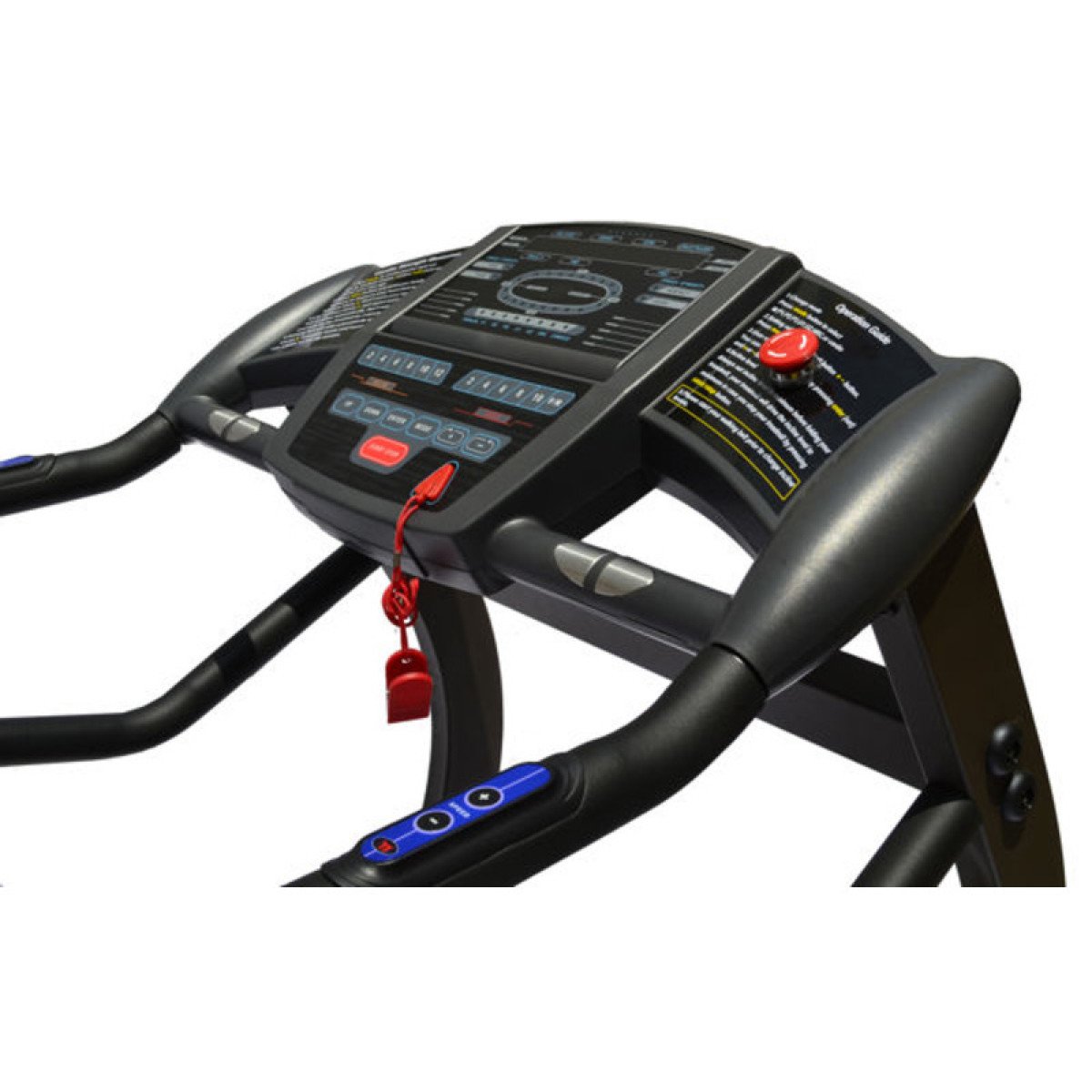 Фронтальные поручни на консоли тренажёра снабжены дублирующими кнопками регулировки скорости и наклона. Регулировка этих показателей на поручнях значительно облегчает тренировку, если тренирующемуся необходимо постоянно удерживаться за поручни. Скорость и наклон бегового полотна можно изменять на консоли тренажёра кнопками UP (вверх) и DOWN (вниз) или кнопками быстрого изменения – 2-4-6-8-10-12. Также присутствуют кнопки изменения скорости и наклона на самих поручнях.