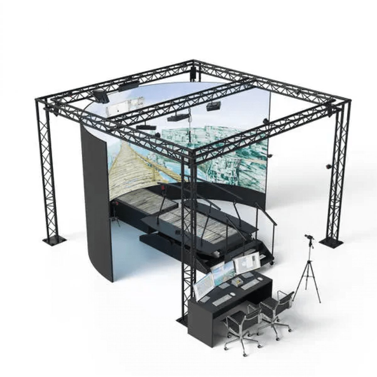 - Синхронизированная среда виртуальной реальности с экраном 180°, проекцией на дорожку и системой объёмного звука