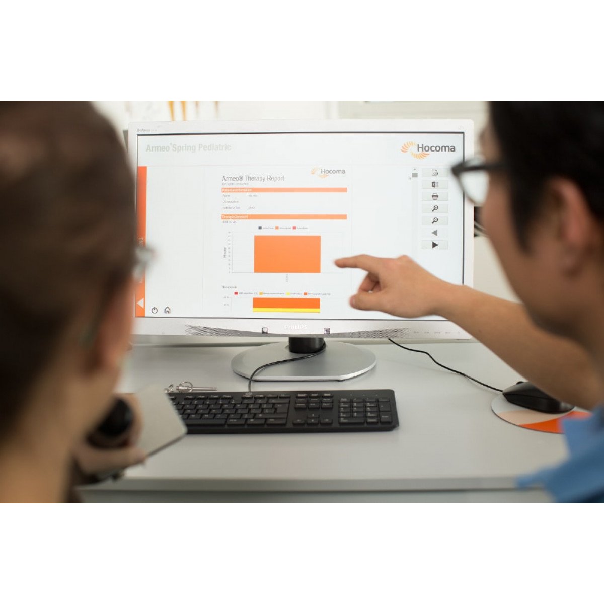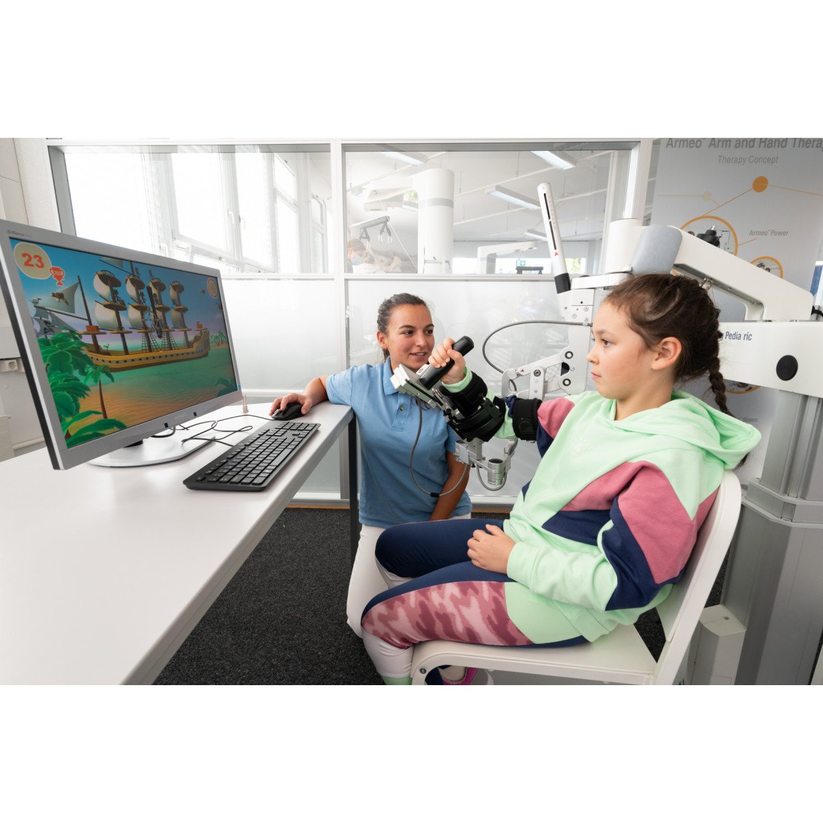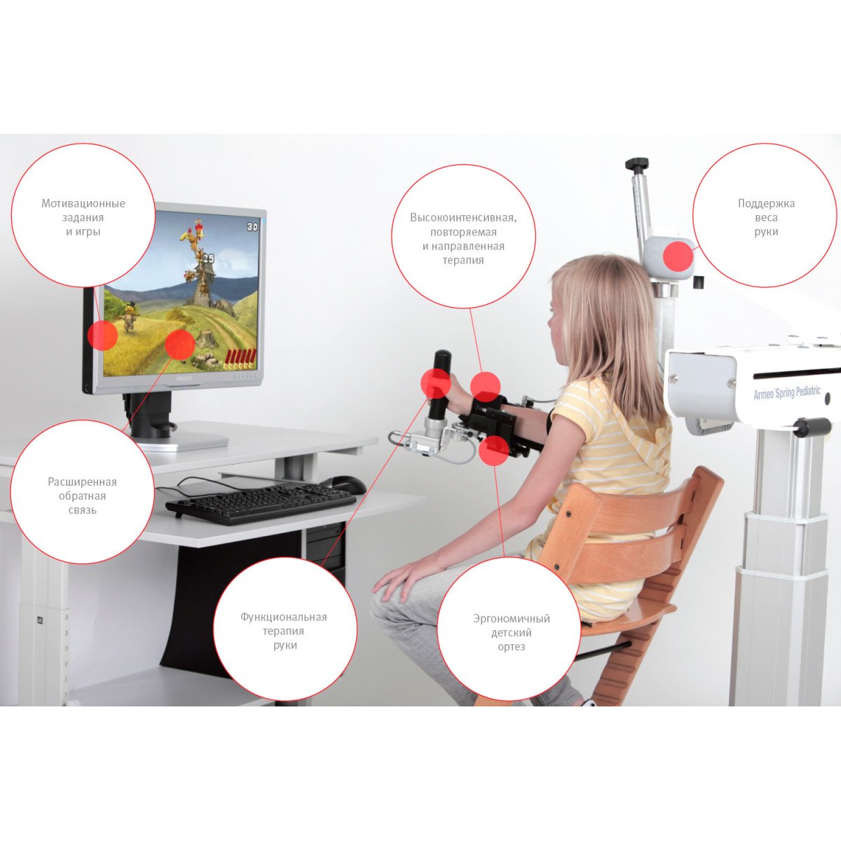Hocoma ArmeoSpring Pediatric (Хокома Армео Спринг Педиатрик) — реабилитационный комплекс для восстановления движений руки и хватательной функции у детей с двигательными нарушениями. Он разработан специально для детей с неврологическими заболеваниями и последствиями травм. Аппарат позволяет проводить интенсивную, но щадящую терапию верхних конечностей в игровой форме.