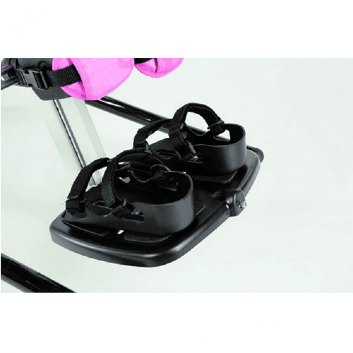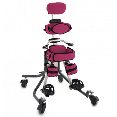 - Комплект 1 (цвет лиловый): шасси на колёсах, контурный подголовник, стол, опоры для стоп, сандалии маленькие, фиксаторы грудного отдела, туловища, коленей