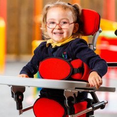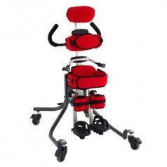 - Комплект 4 (цвет красный): шасси на колёсах, подголовник с боковыми поддержками, стол, опоры для стоп, сандалии маленькие, фиксаторы грудного отдела, туловища, коленей