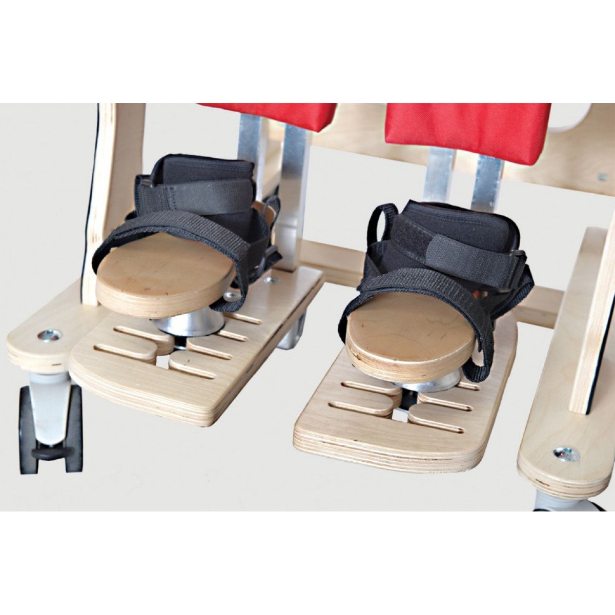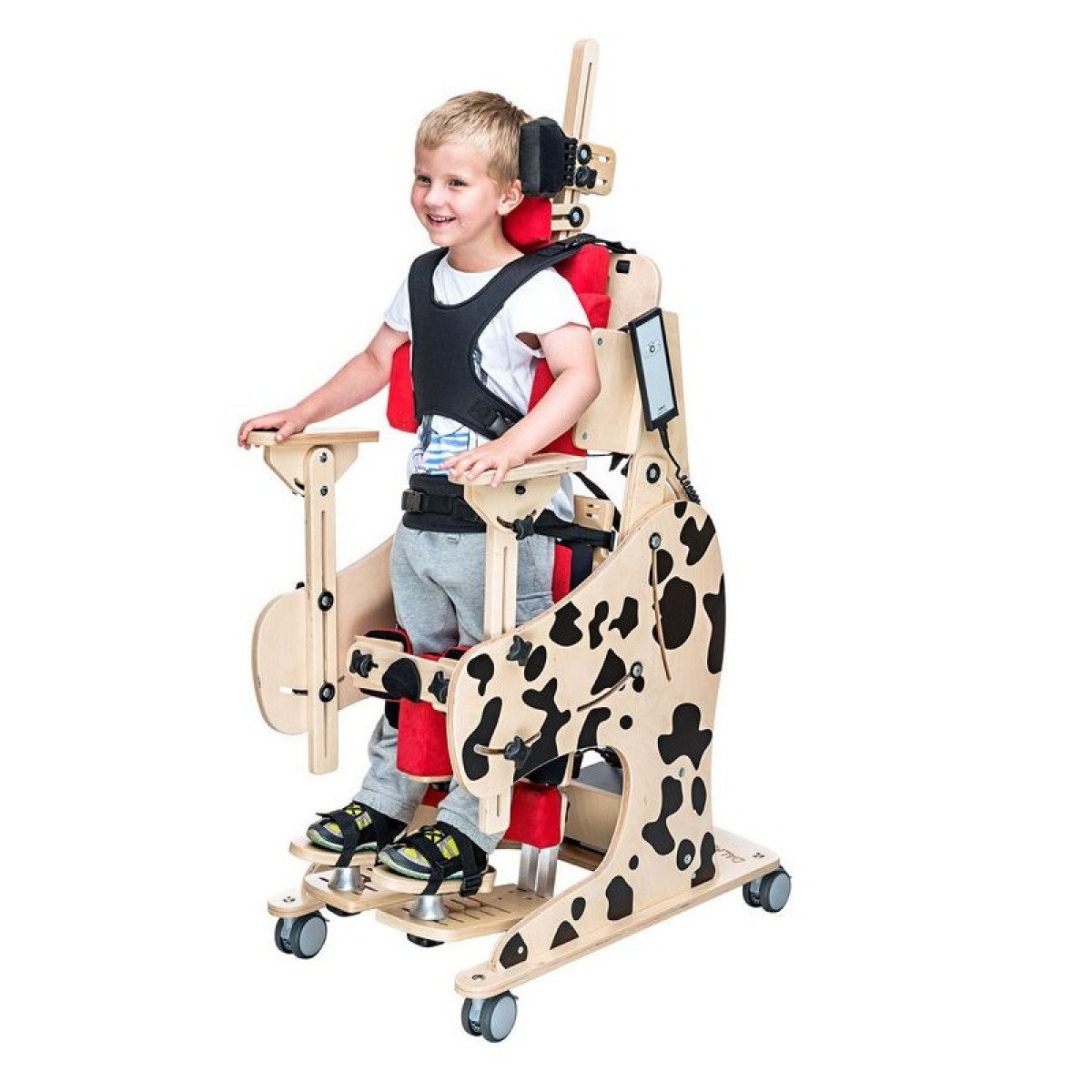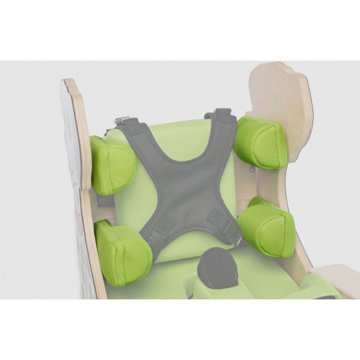 В кресле-коляске реализована надежная система удерживающих подушек и ремней безопасности, что обеспечивает ощущение уверенности и защищенности во время использования. Устройство также предлагает продуманную систему безопасности. Жилет и ремень оснащены уникальной системой «Схвати и потяни», что значительно упрощает процесс размещения ребёнка в устройстве. При необходимости его можно быстро и безопасно переместить, что является важным аспектом в ситуациях, требующих незамедлительного реагирования.