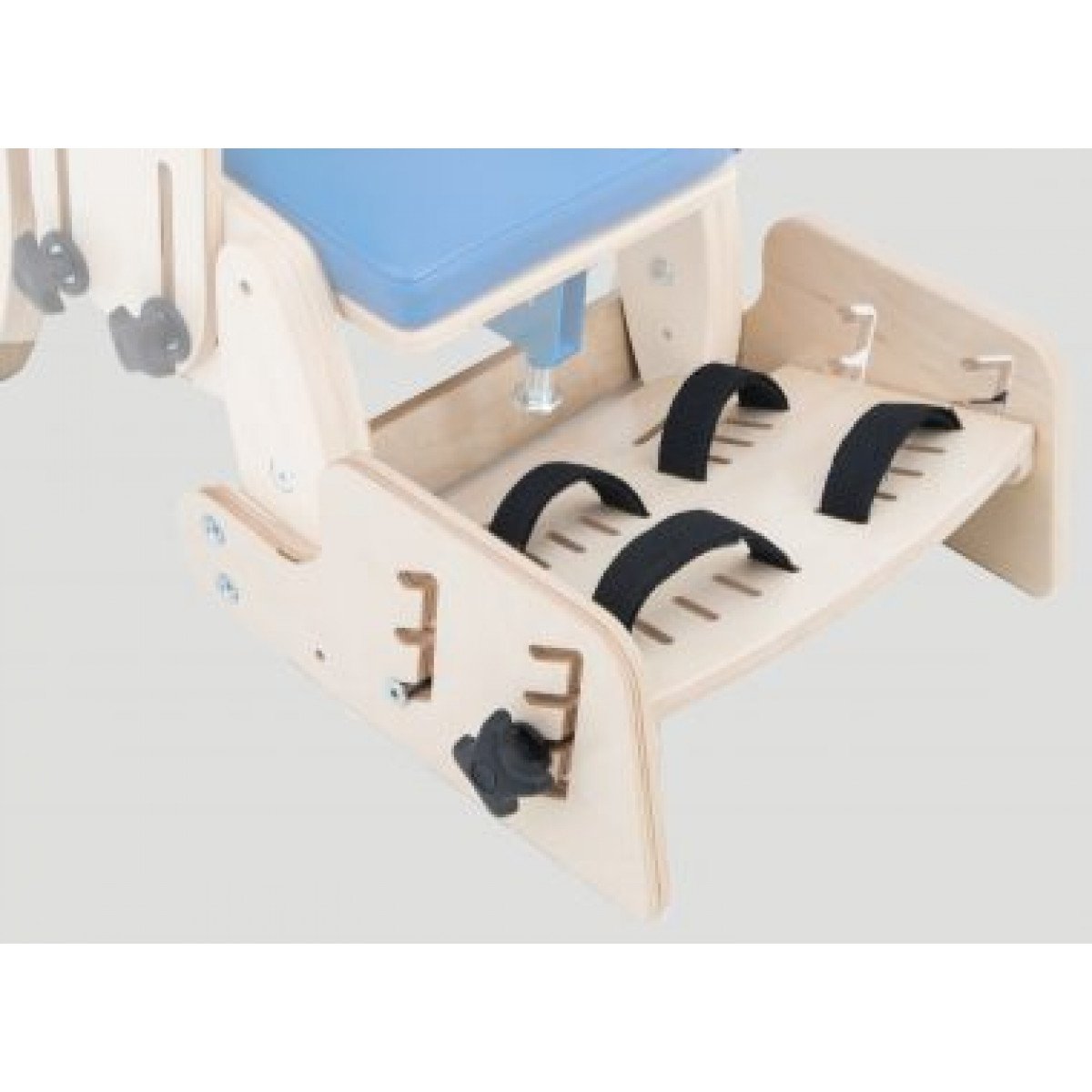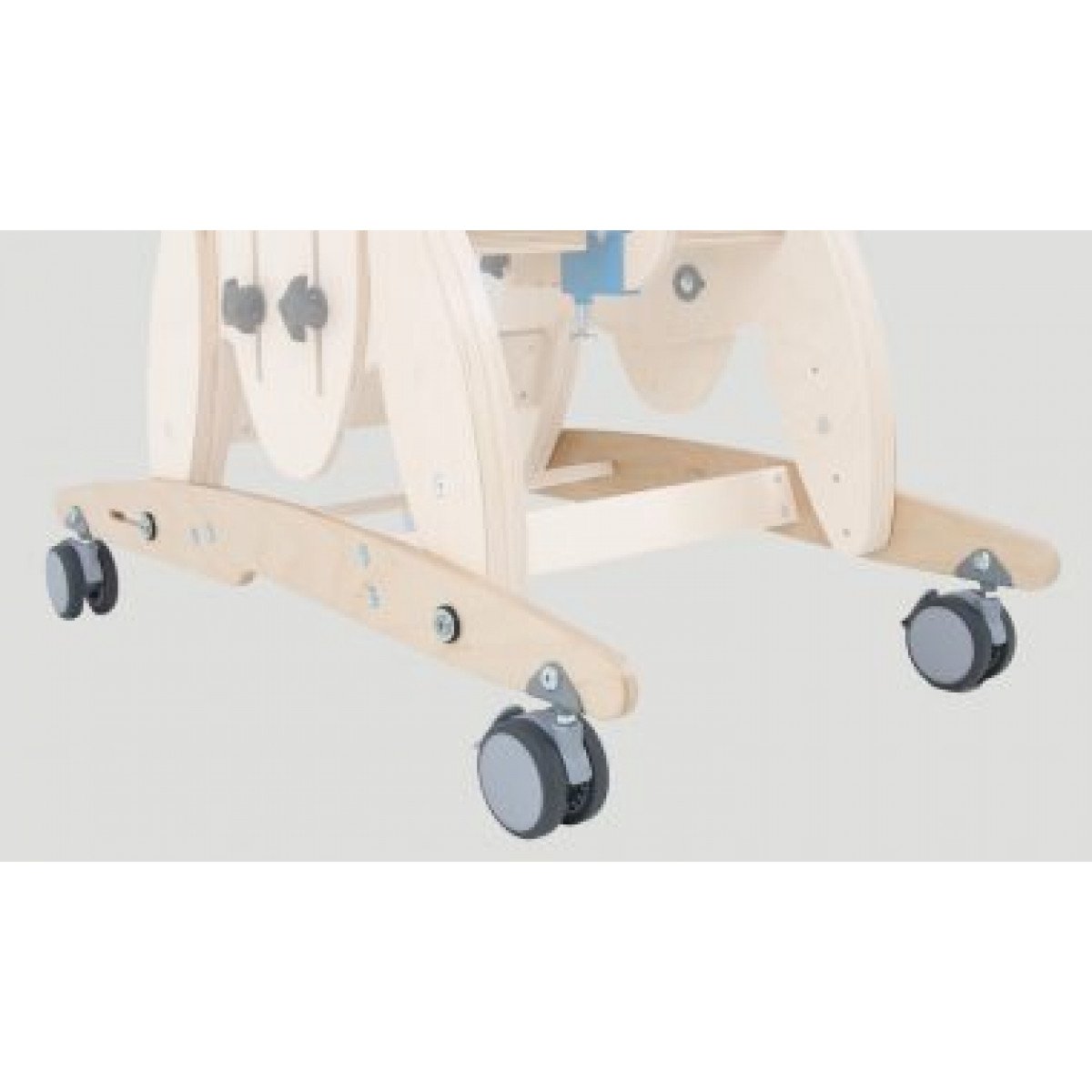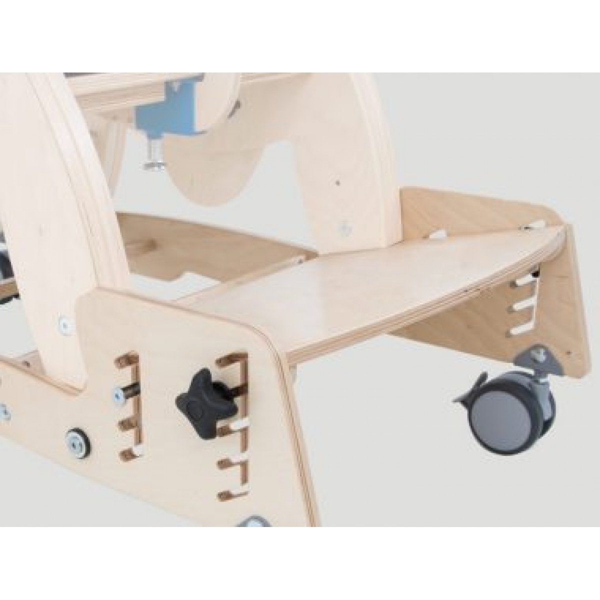 Базовая рама коляски снабжена четырьмя вращающимися колёсами с тормозами, которые гарантируют лёгкость и маневренность передвижения. Для повышения уровня комфорта ноги пользователя крепятся на специальной регулируемой подставке с ремнями. Это не только помогает обеспечить поддержание правильного положения, но и минимизирует риск случайного выпадения ног из коляски.