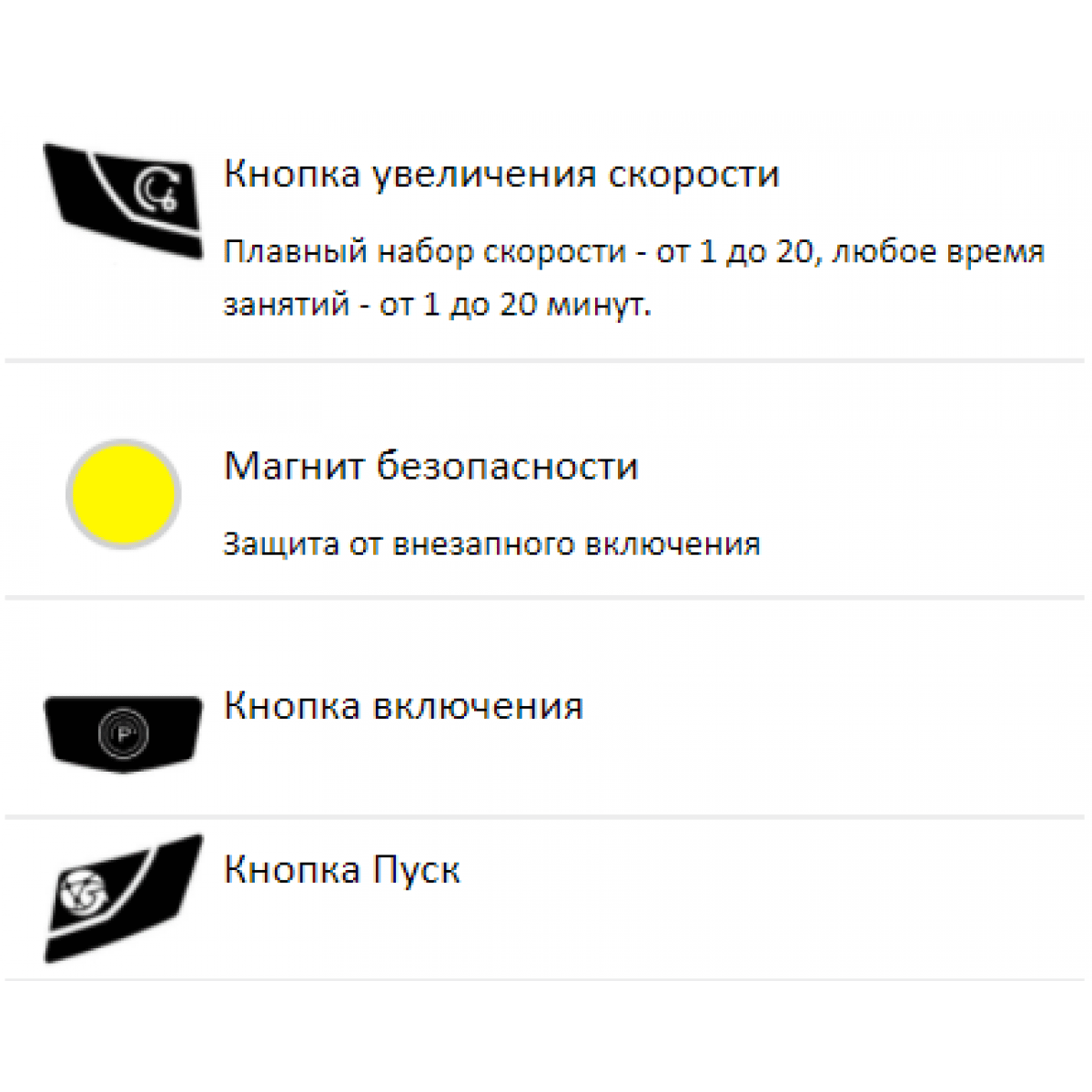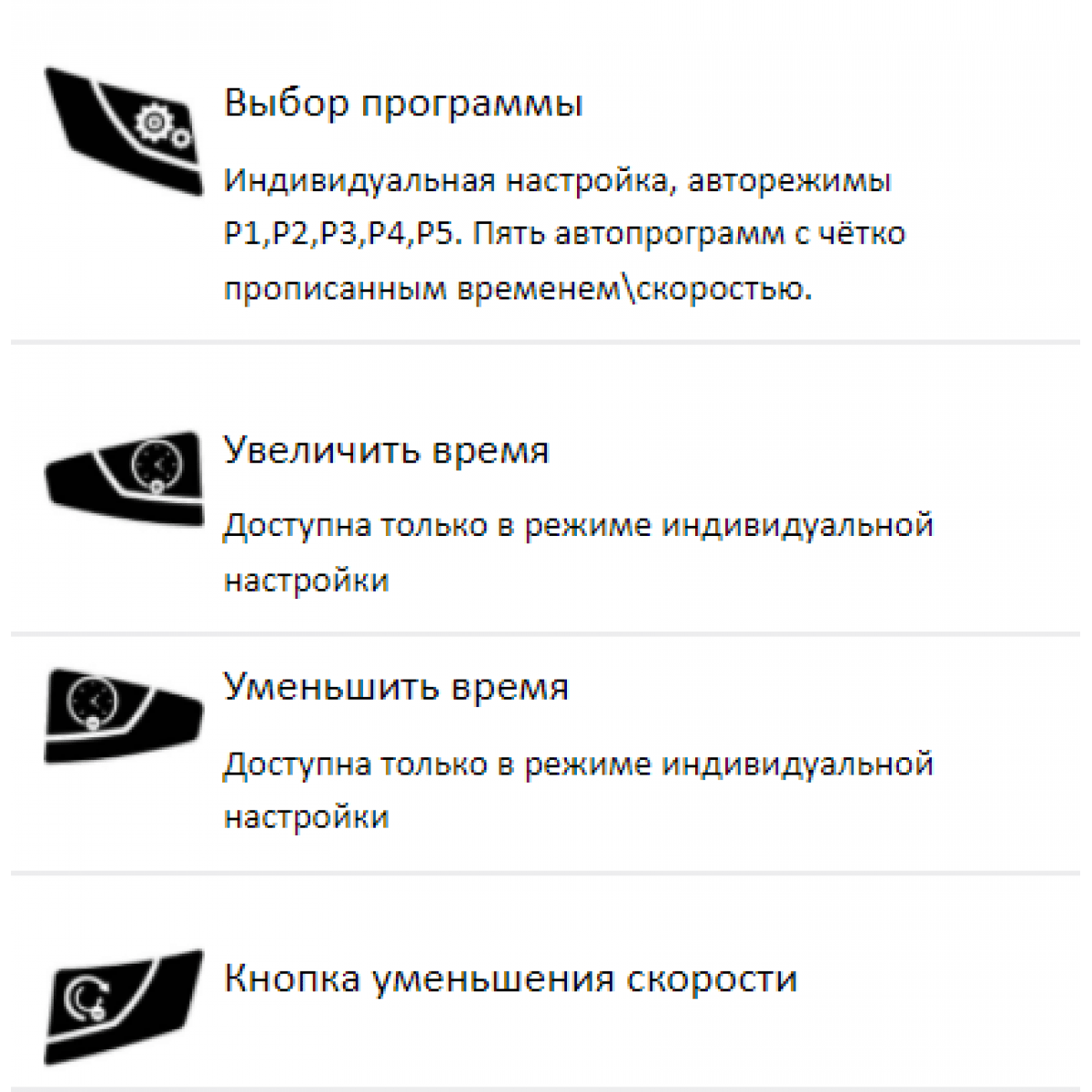 - 5 автоматических режимов (разминка, низкая скорость, средняя скорость, высокая скорость, «авто»)