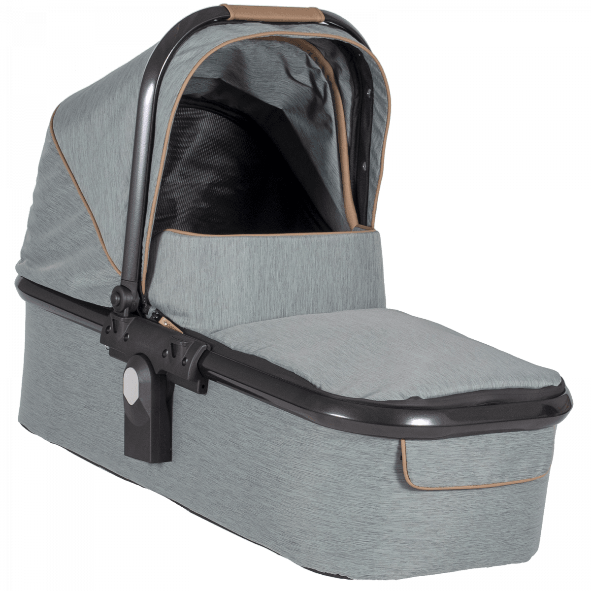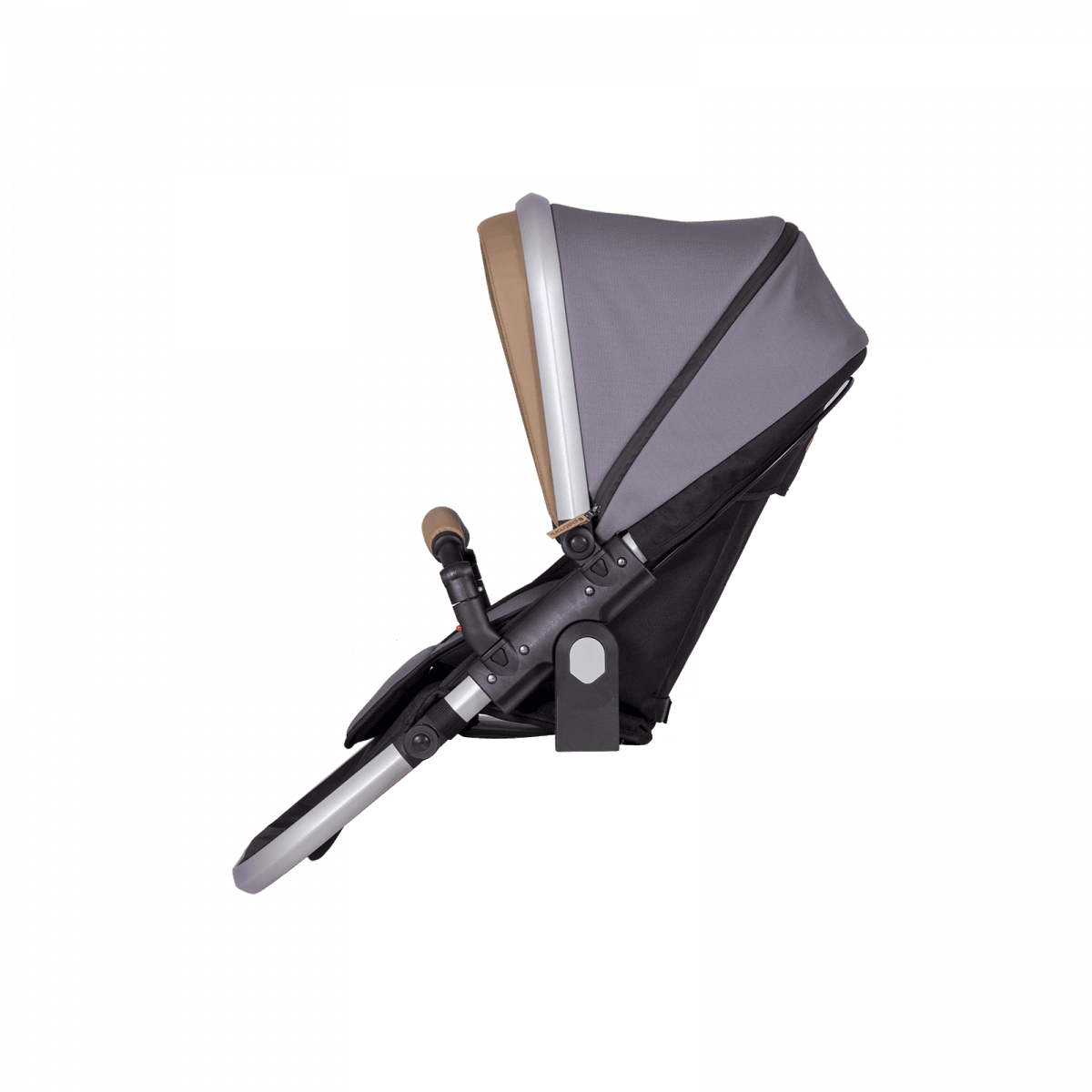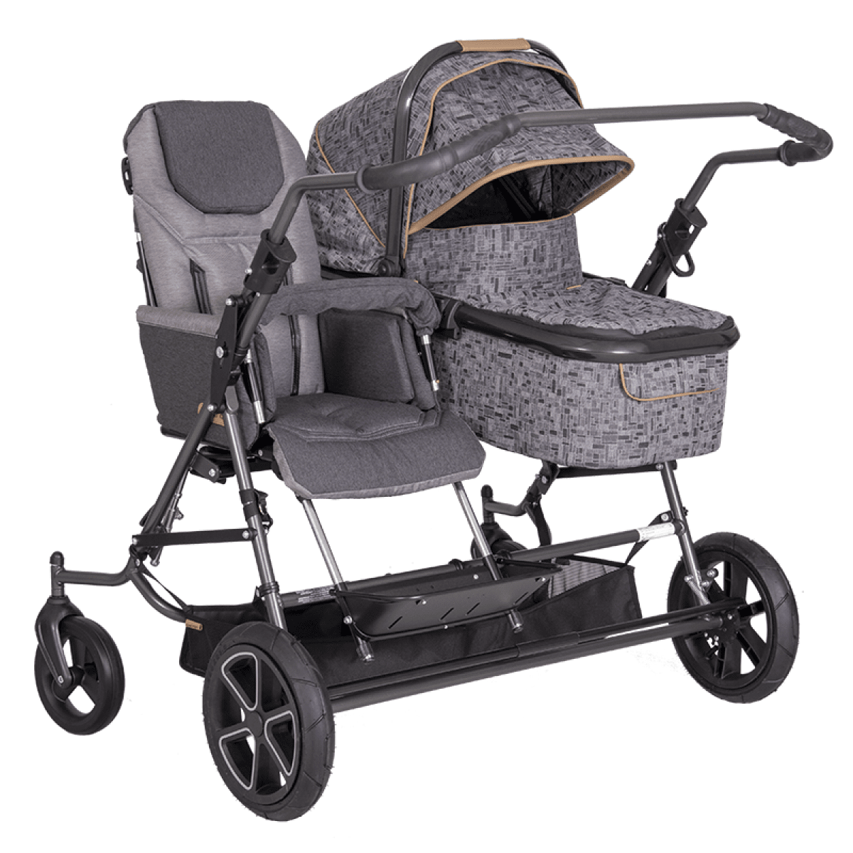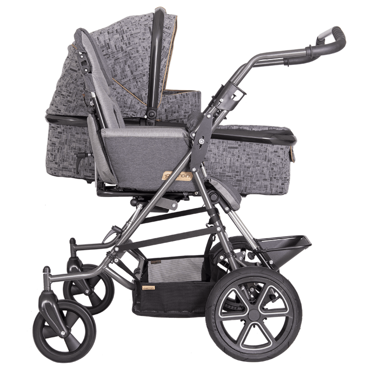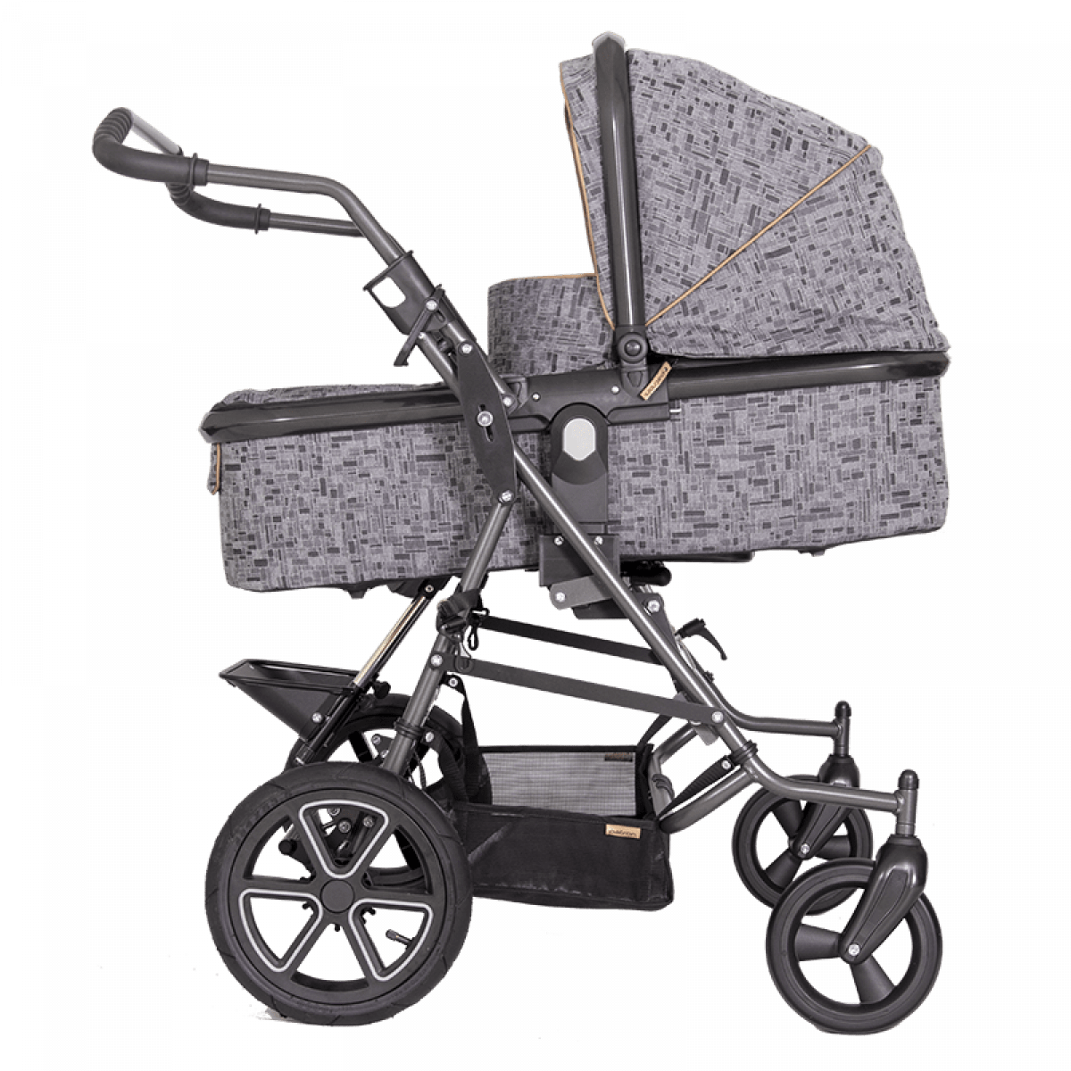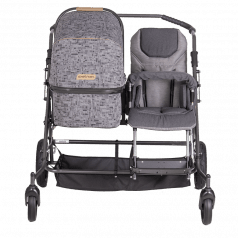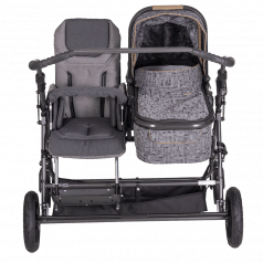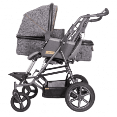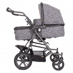 Коляска построена на полностью складывающемся шасси Tom 4 с пружинной подвеской, задними пневматическими колёсами и поворотными передними колёсами — она устойчива, плавно едет и легко управляется. Сиденье и люлька съёмные, могут устанавливаться по ходу или против хода движения, а при необходимости использоваться отдельно на собственных шасси, что делает систему максимально гибкой.