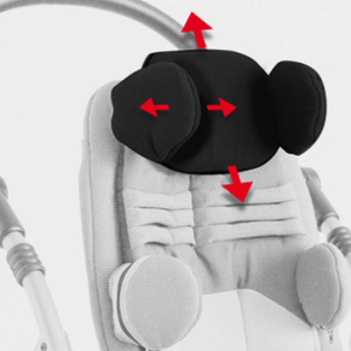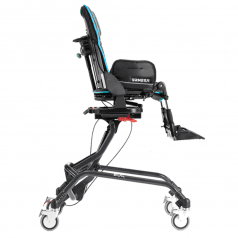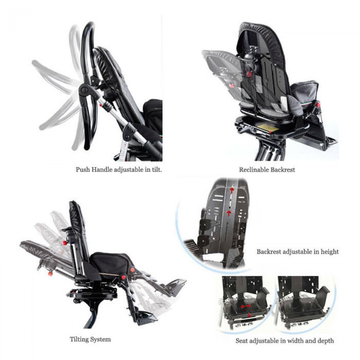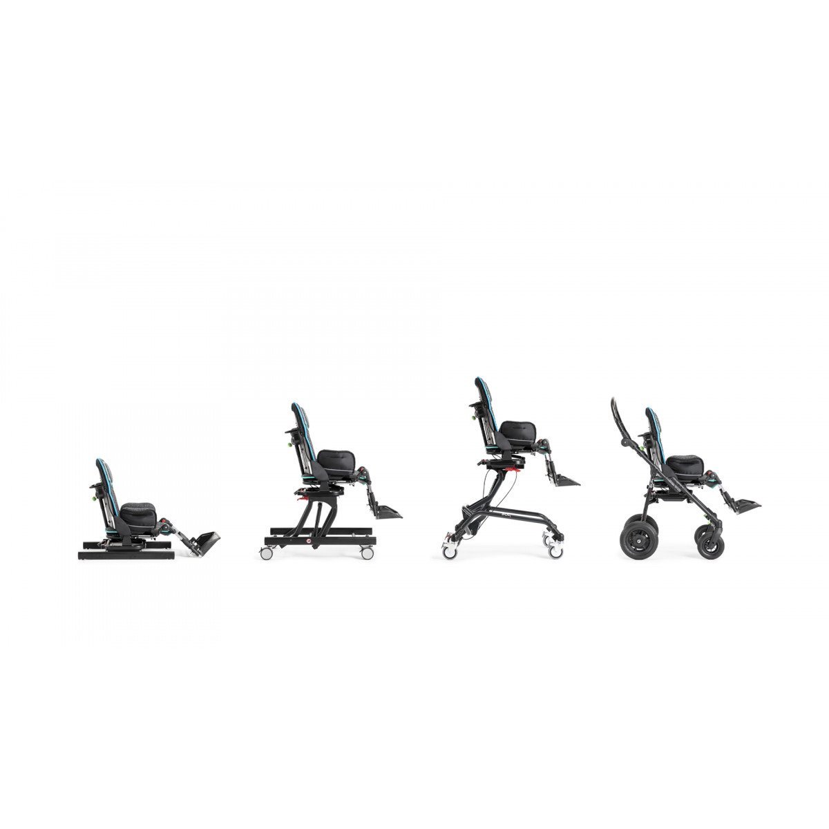 Жёсткая спинка с наклоном до 40° регулируется в высоту до 10 см. (размеры 1-2) и до 15 см. (размеры 3-4), соответствуя физиологическому изгибу тела. Откидная подножка имеет регулировку сгибания-разгибания, а опора для ног может настраиваться по высоте и углу, соответствуя физиологическому изгибу коленей. Встроенный подголовник, находящийся в спинке кресла, обеспечивает поддержание головы ребёнка во время любых изменений в положении сиденья и спинки.