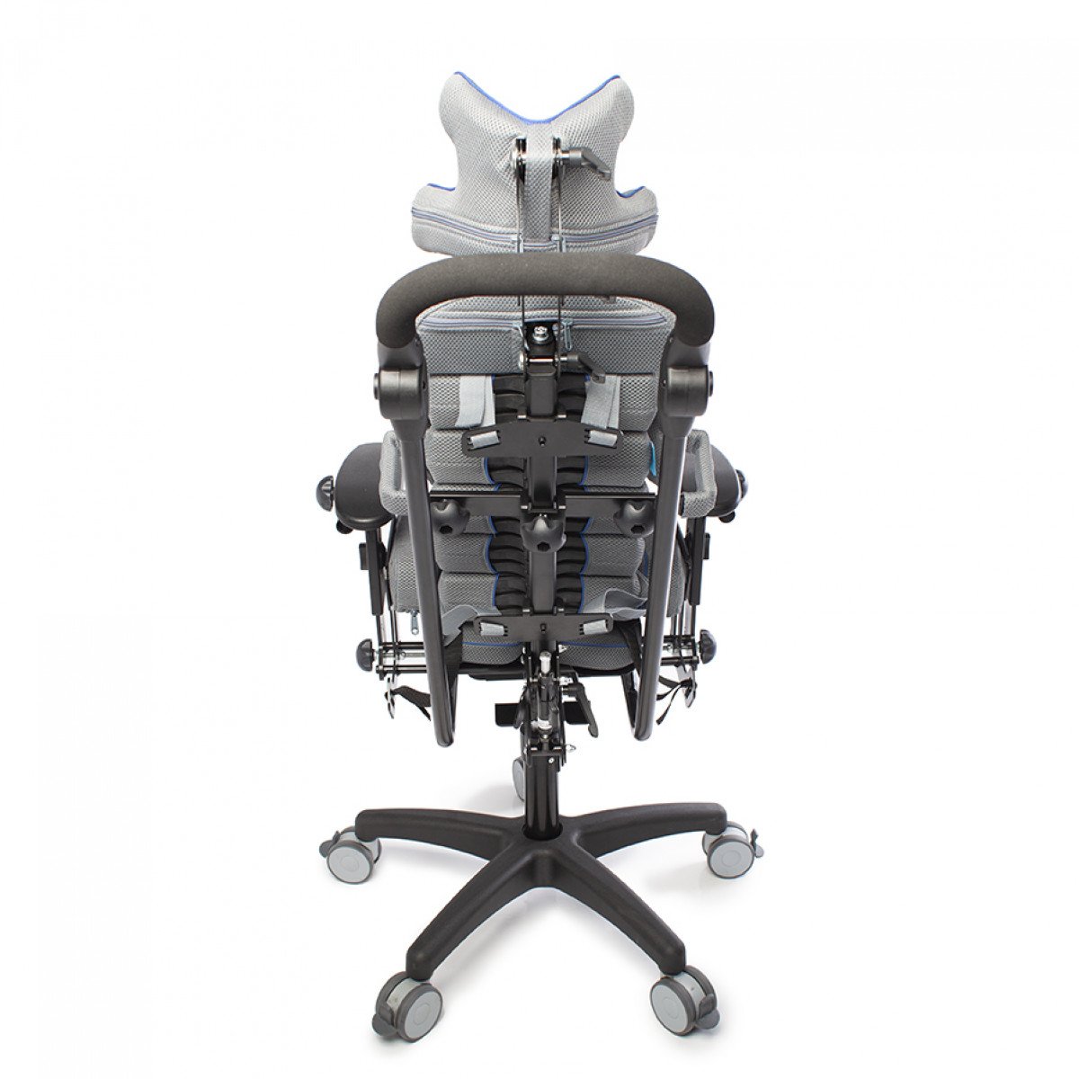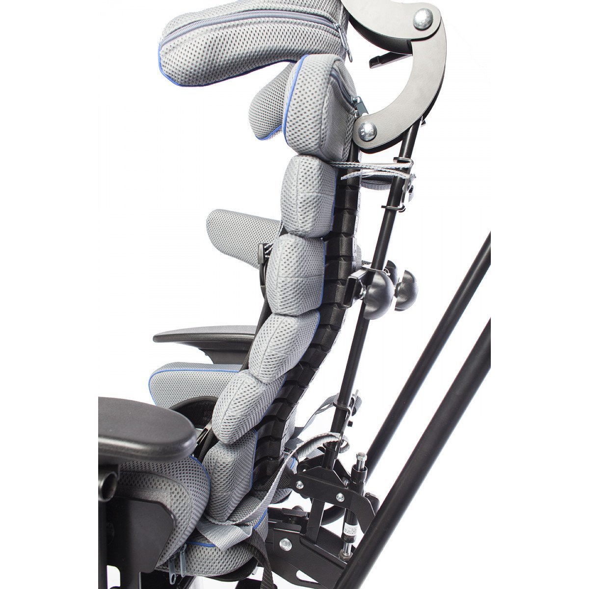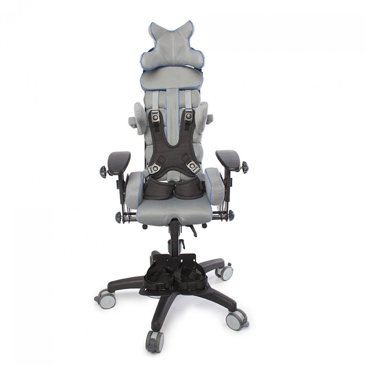 Кресло оснащено специальным подголовником, который позволяет поддерживать голову в правильном положении, уменьшая нагрузку на шею. Регулируемые подлокотники обеспечивают дополнительный комфорт и могут быть настроены под индивидуальные потребности пользователя. Боковые упоры для туловища помогают удерживать корпус в вертикальном положении, что особенно важно для тех, кто не может сохранять устойчивость самостоятельно.