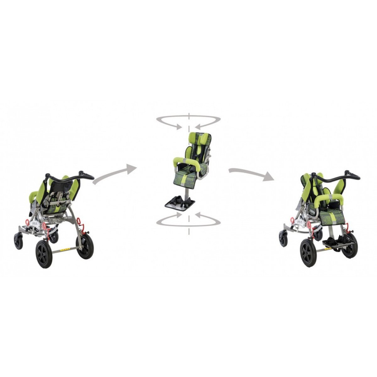 Если возникает необходимость, коляску можно установить в положении лёжа таким образом, что ребёнок может в ней спать. Устройство доступно в 3 размерах с обширным ассортиментом аксессуаров, с помощью которых можно ещё лучше приспособить коляску к индивидуальным потребностям ребёнка.