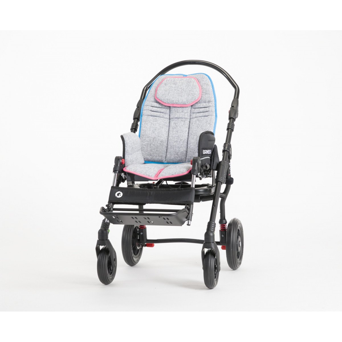 Выпускается в двух размерах: малый и большой. Малый размер S подходит для детей ростом 90-120 см и весом 35 кг, большой размер L подходит для пользователей ростом 115-140 см и весом 45 кг. Подголовник встроен в спинку, поэтому голова ребёнка постоянно поддерживается во время регулировок сиденья и спинки. Жесткая спинка с наклоном до 40° регулируется в высоту до 10 см (размеры 1-2) и до 15 см (размеры 3-4), соответствуя физиологическому изгибу тела. Откидная подножка имеет регулировку сгибания-разгибания, а опора для ног может настраиваться по высоте и углу, соответствуя физиологическому изгибу коленей.