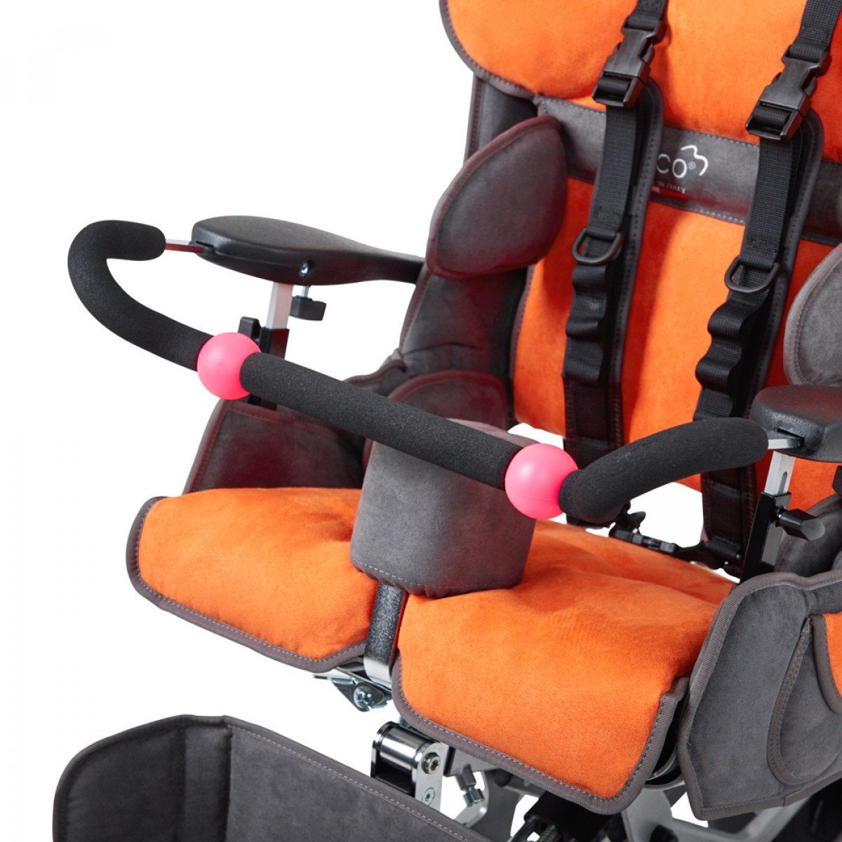 Мягкая дышащая обивка кресла снимается и легко чистится. Для комфортного пребывания предусмотрена встроенная подушка против пролежней. Средний слой обивки амортизирует движения ребёнка, а внутренний оснащён боковыми защитами.